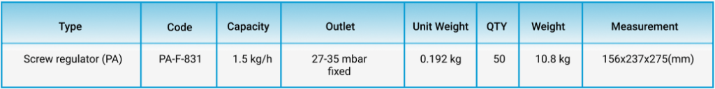 Low pressure single stage/ outlet pressure range 27-35 mbar / capacity 2kg/h