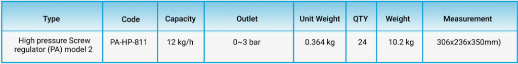High pressure single stage/ outlet pressure range  0-3 bar / capacity 12kg/h