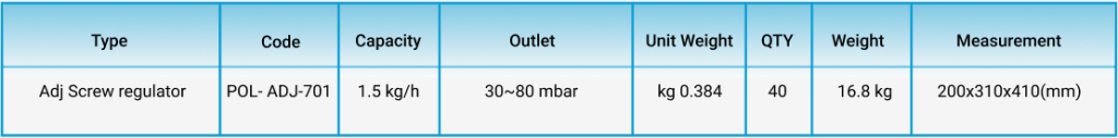 Low pressure single stage/ outlet pressure range 22-50 mbar / capacity 1.5kg/h